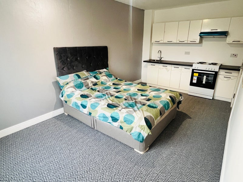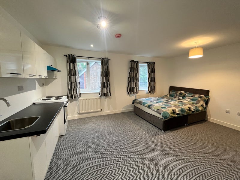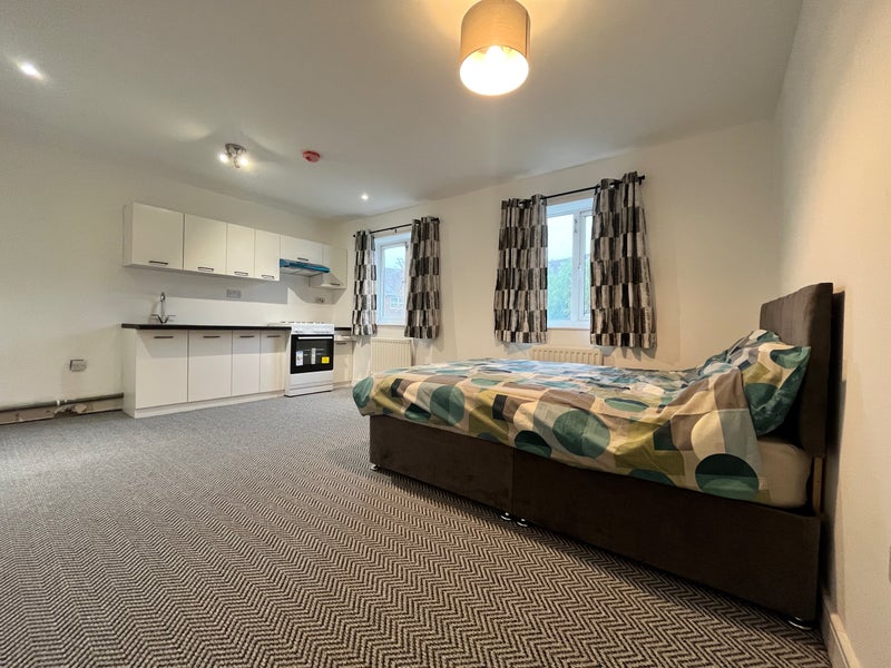 Rent : £900.00 pcm (Approx measurements : 4.63 m x 3.60 m). This furnished studio is found on the 1st floor, includes double bed, wardrobe, personal kitchen area, and en-suite shower room. Suitable for a single tenant.