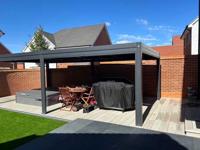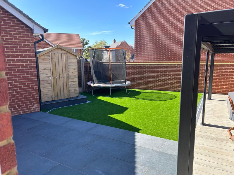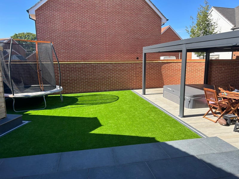 Large lounge area opens up to enclosed garden with patio, decking and artificial grass