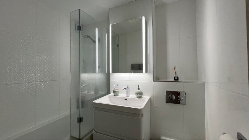 Contemporary Bathroom: Modern bathroom with strong shower pressure, bathtub, mirror cabinet and extra storage.