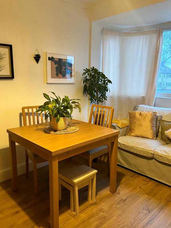 Spacious room with sofa included and dining table. Fully furnished. Very well lit maisonette in the centre of bexleyheath. walking distance to bus facilities, shopping centre, cinema and more. Shared bathroom and kitchen with another lady.