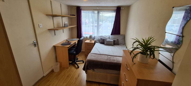 The rooms comes fully furnished with a double bed, bedside cabinet, wardrobe, chest of drawers, desk and chair.