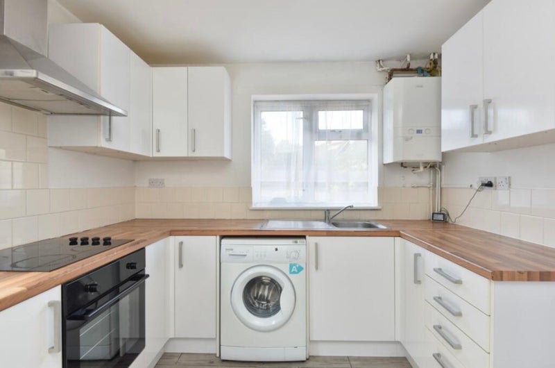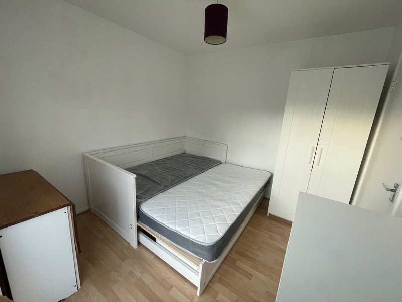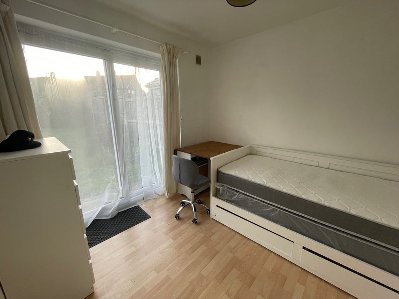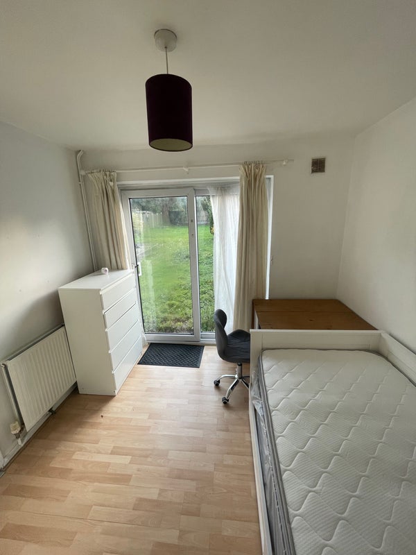 Fit double room with patio door towards garden in 3 bed house. Room is furnished, has extendible bed so can free up space if needed. Kitchen equipped with washing machine and fridge. Internet included in the bills. House has both toilet room and a bathroom. There is access to outside of the property through the patio door.
