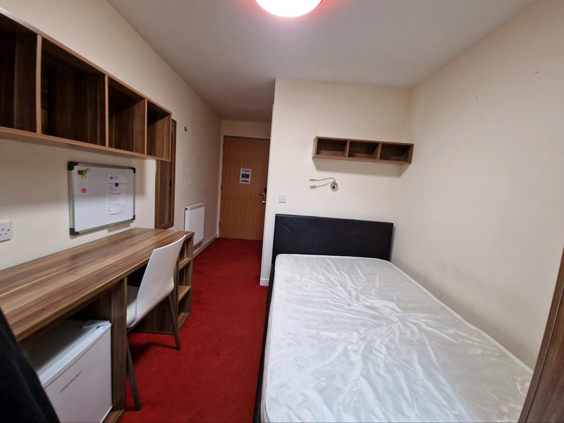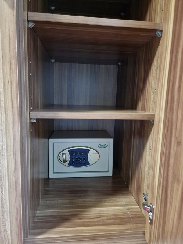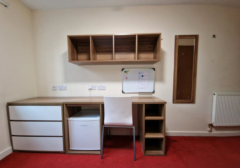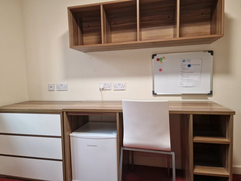 The room comes fully furnished and offers plenty of storage and workspace. It features a large desk with multiple shelves and storage compartments, making it ideal for studying or working from home. There is also a private refrigerator, spacious wardrobe, and additional drawers and shelving to keep everything organised. A safe/vault is also included for storing valuables securely.