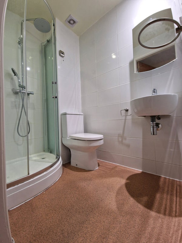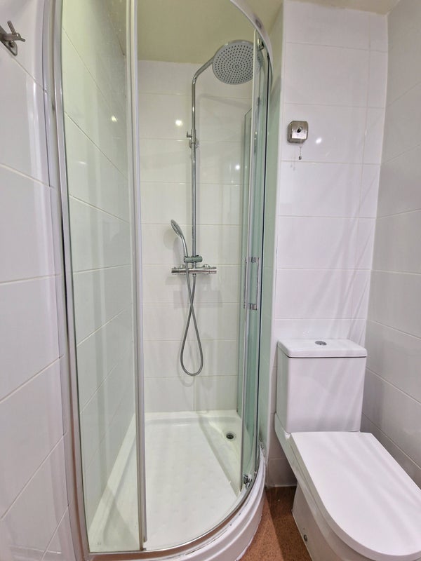 The room includes a private en-suite bathroom with a modern shower that has both an overhead rainfall shower and a handheld shower head. The room also has a radiator with adjustable heat levels, allowing you to control the temperature and stay comfortable.