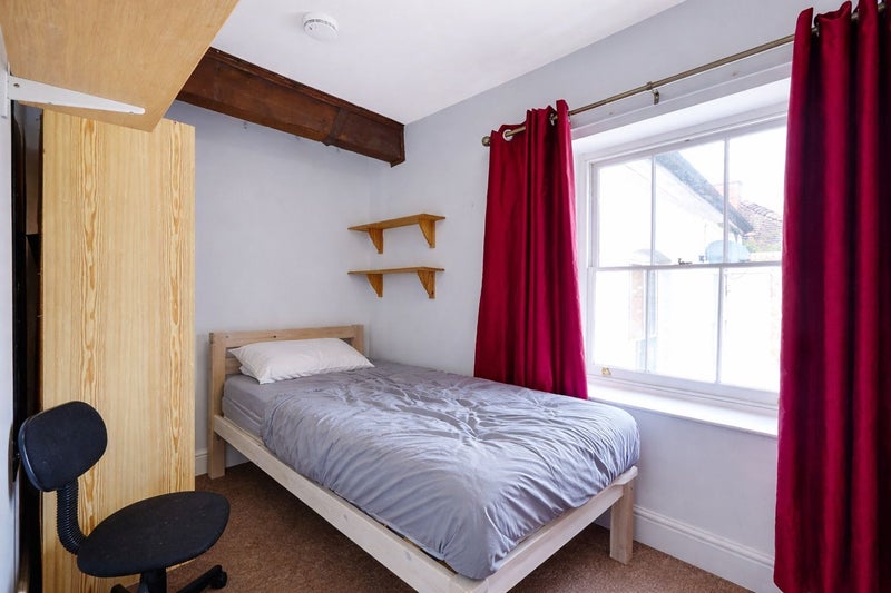 This property has 5 double bedrooms and a spare storage room, a large living room with a kitchen off to the side, a downstairs WC, and a large bathroom that includes a bath with a shower. It’s perfect for sharers looking to get a good size property without all being on top of each other, and equally affords a sociable communal space that is fully furnished with sofas and dining furniture, the bedrooms all includes beds, desks, drawers, and wardrobes, plus the kitchen includes all white goods. The entrance the property is also nicely away from the main thoroughfares and the property actually backs onto the street so you are in a nice private little mews off the beaten track, plus you have an area for locking your bike up.
