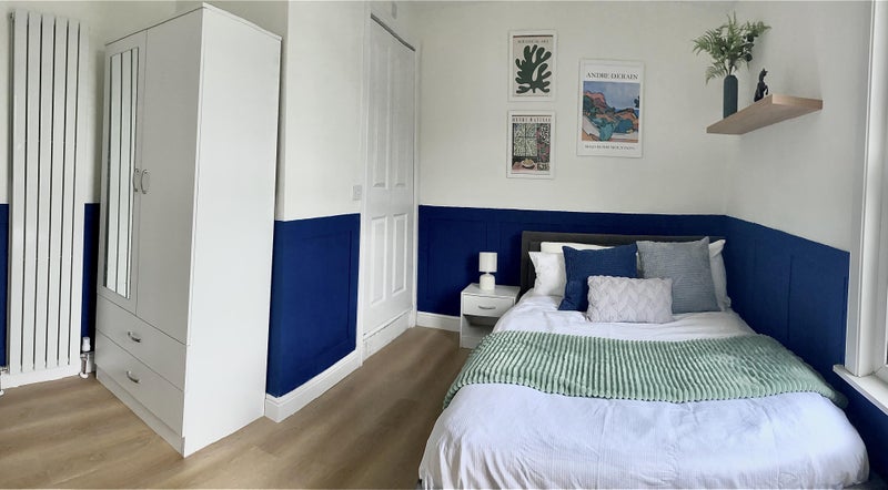 Newly refurbished Double room with new large windows, new furniture and your own bathroom (Shower, toilet & basin). Feel free to make the space your own changing picture frames, and adding your own touch to the room.