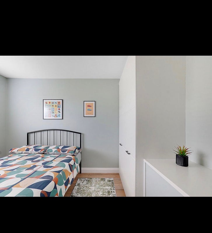 The room is fully furnished with a double bed, wardrobe, and storage space—ideal for someone looking for a peaceful and relaxed place to live.
