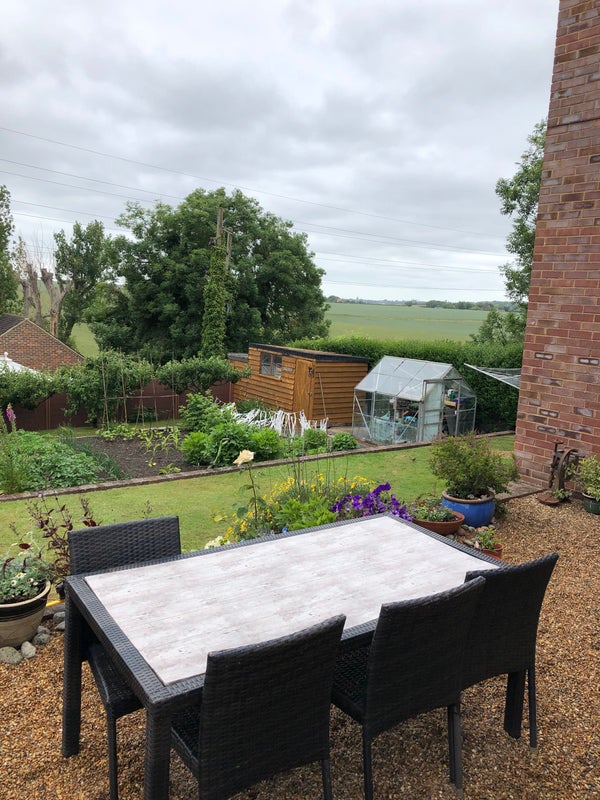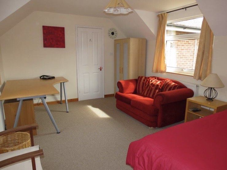 This is a king-sized bedroom available in our family home. The room is 16. 34 sq metres and has a double bed, wardrobe, chest of drawers, bedside units, large desk, 2 seater settee, wifi and freesat connection. The room has beautiful dual aspect windows, with views across the fields and up the lane into the village. Almost sole use of the large family bathroom (we have an ensuite) with a 1200mm sq walk in shower, toilet, basin and bath.