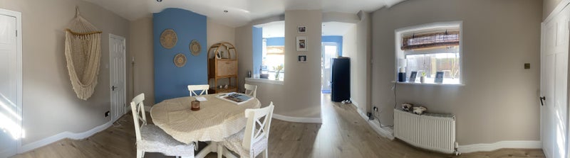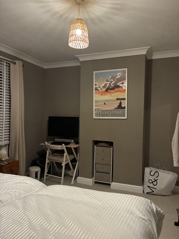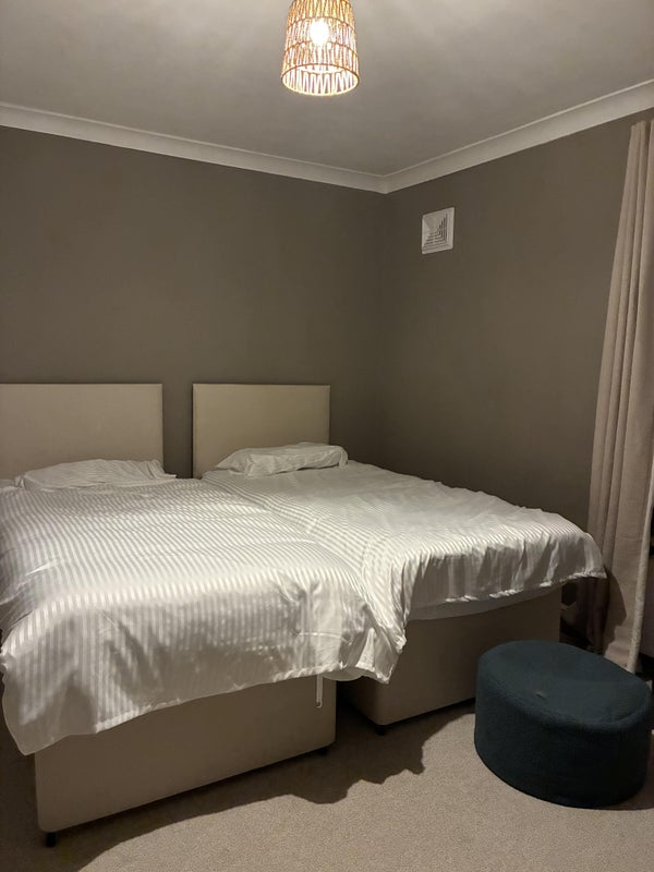 Large double room in light airy 3 bed house with garden. Parking on street. Short walk to Sunny Sands beach, harbour and town. Bedroom has twin beds that clip together to make king size.