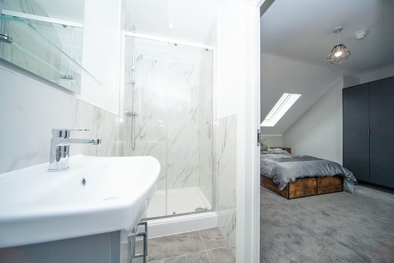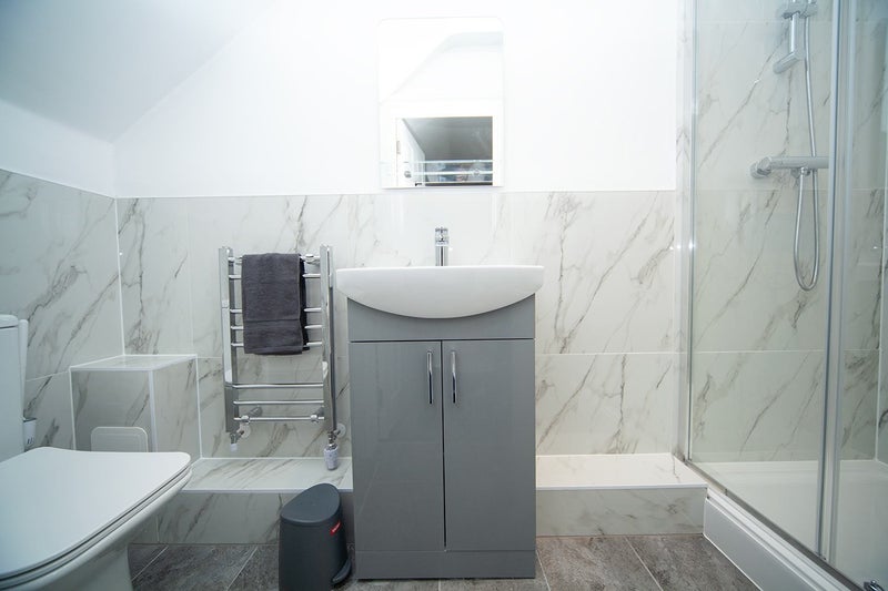 The En-Suite is decorated with Carrera Marble porcelain tiles and high-spec fittings, with a wide double-door shower.