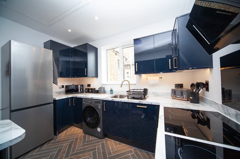 The house has been completely re-furbished from back-to-brick and everything in the house is brand new. As part of the extensive refurbishment, it features an ultra-modern hi-spec kitchen with marble-look worktops, solid brass fittings and cutting-edge appliances (no cheap ceramic hobs here).