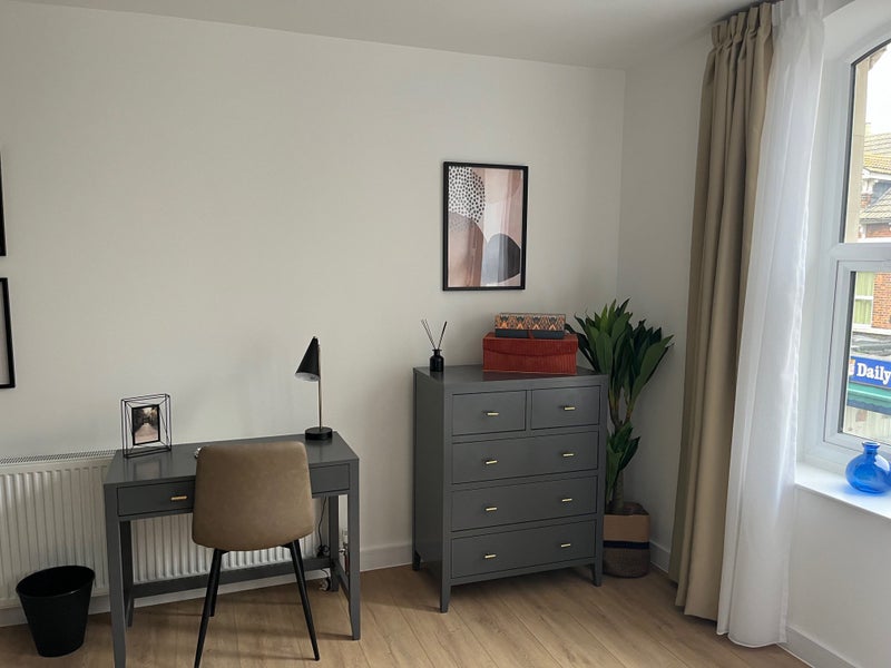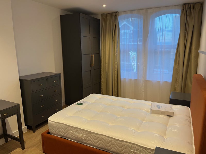 Spacious double bedroom available to rent in newly converted building on High Street. The building has secure integrated video system to each room, secure lockable internal bike store (extra), new kitchens fully equipped with high end appliances, including washing machines and tumble dryers, communal room with sofa and dining area and roof terrace.