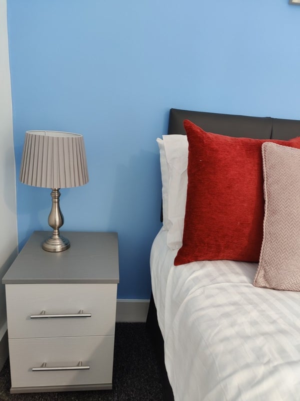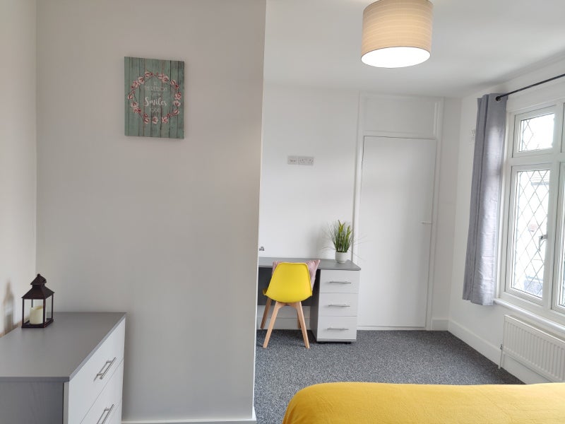 Modern house, Room FULLY furnished with Bed & Orthopaedic Mattress, DESK and CHAIR, Wardrobe, Chest of drawers, bedside table with lamp.