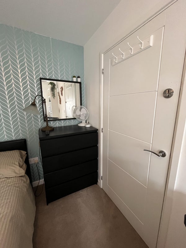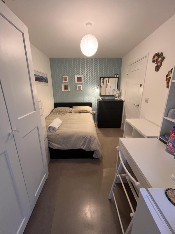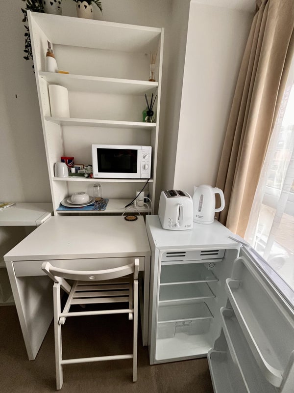 Very private room with all you need: comfy double bed, smart TV, wardrobe and chests of drawers, desk/chair, bookcase, microwave, fridge, kettle, underbed storage, blackout curtains and more, including a garden.