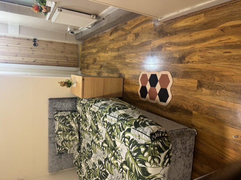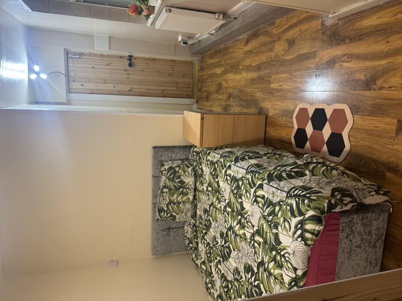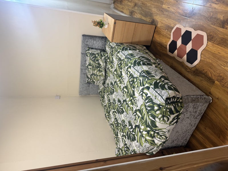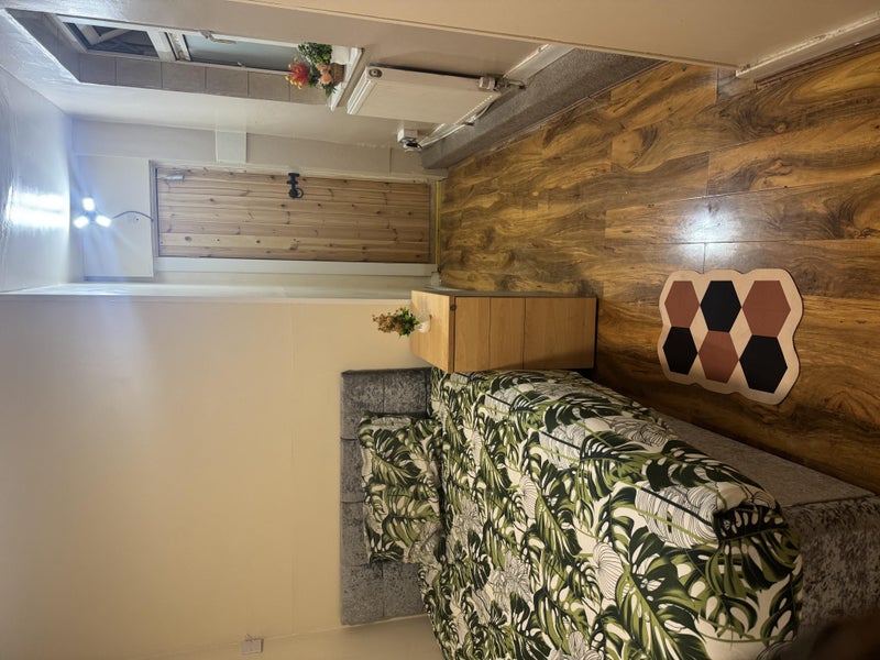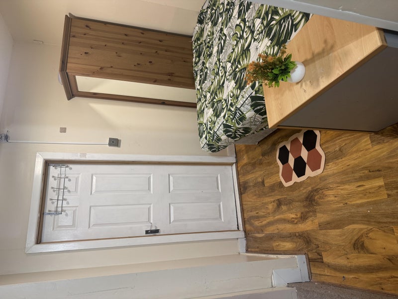 This cozy single room offers a comfortable and stylish living space, ideal for students or professionals. It features a modern upholstered bed with eye-catching tropical bedding, a practical bedside cabinet, and warm wooden flooring throughout. The room is bright and inviting, with neutral décor that suits any style. A radiator ensures year-round comfort, while decorative touches like plants and a small rug add charm. Conveniently located near a bathroom area, the space is both functional and welcoming. Perfect for someone seeking a clean, low-maintenance room in a quiet and well-kept home
