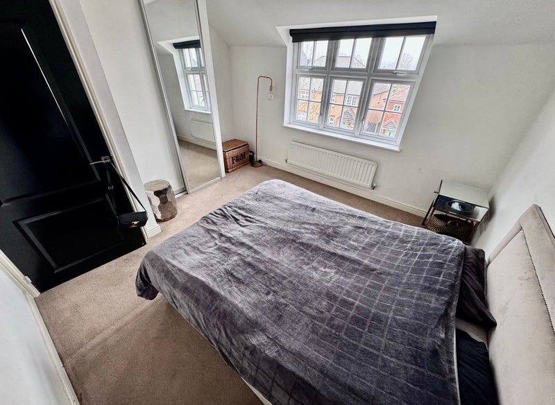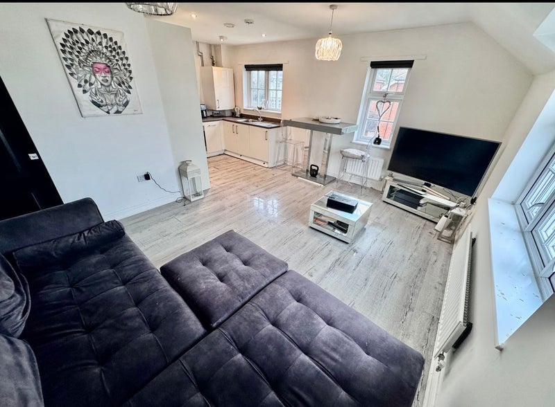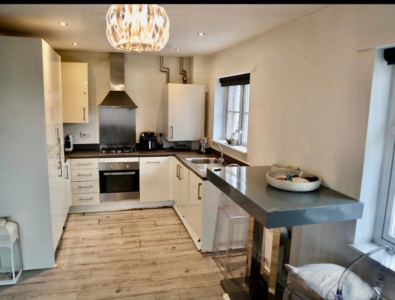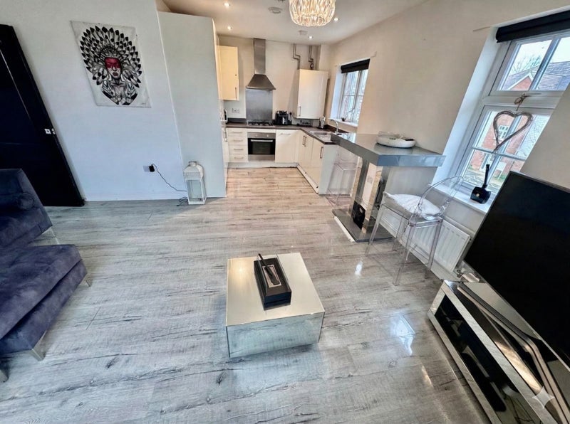 The property boasts a bright and airy open-plan living and dining area, highlighted by a signature window that offers abundant natural light. The contemporary kitchen comes fully equipped with integrated appliances, including a oven, gas hob, and fridge-freezer, perfect for modern living.