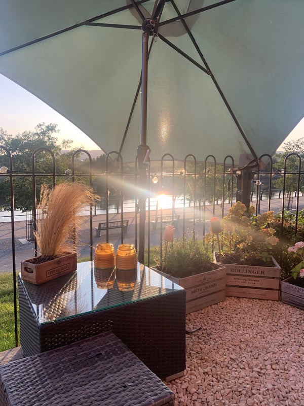 Detached, riverside property, enclosed garden, ‘champagne terrace’, quiet, great views and plenty of parking.