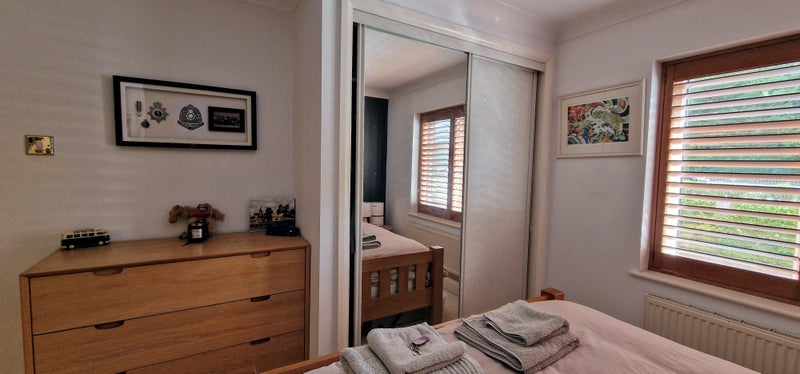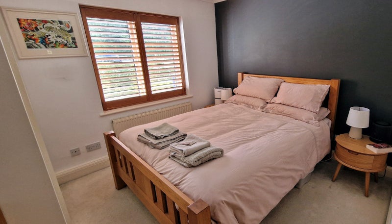 Comfortable double bedroom with ensuite bath/shower, large double wardrobe, shared well-equipped kitchen, shared use of dining room and balcony.