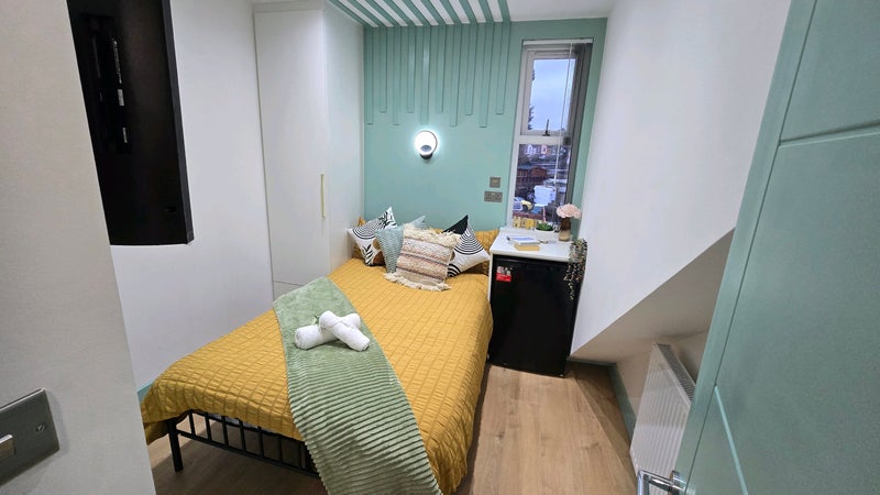 • Smart layouts with double bed with mattress, wardrobe, bedside table, desk & workspace