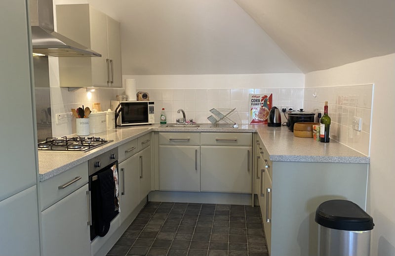 This 2-bedroom top floor apartment has a spacious open plan sitting/kitchen area and one communal bathroom.