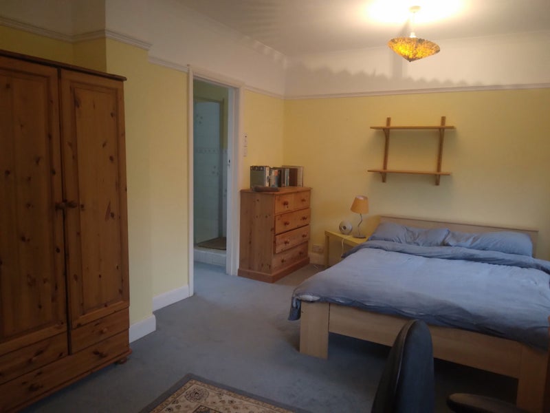 The homesharer will have an en suite double room on the first floor with a road view, a double bed, chest of drawers, desk, chair and storage space.