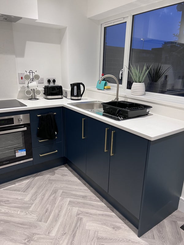 - Modern kitchen with induction hob, oven, microwave, kettle, washing machine and separate dryer