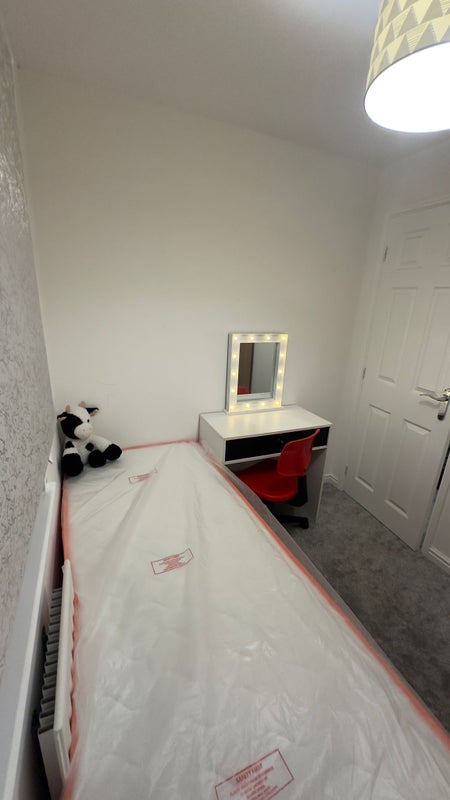 A furnished single bedroom is available in a modern mid terraced house. Bedroom comes with brand new mattress and a big double wardrobe along with a dressing table and chair/stool. The property is located just a 32minutes walk to train station. Property has 3 bedrooms, 2 bathroom and downstairs WC.
