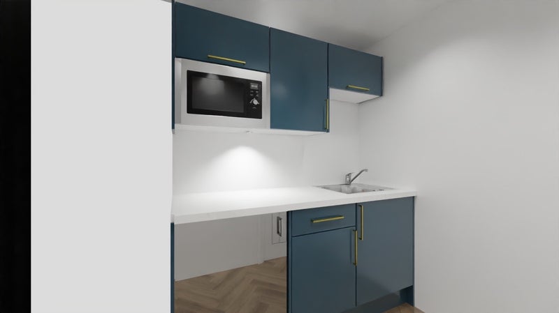 - Studios: kitchenettes with fridge, sink, cupboards & sockets for additional appliances.