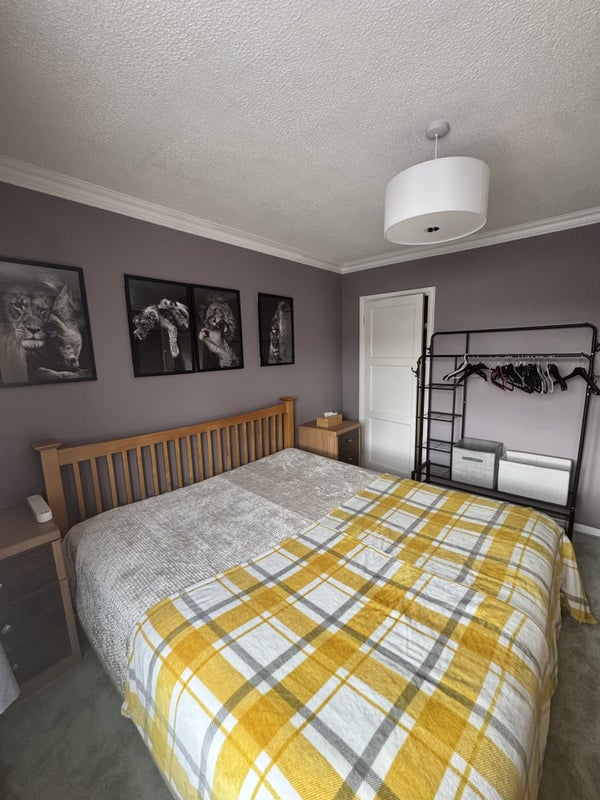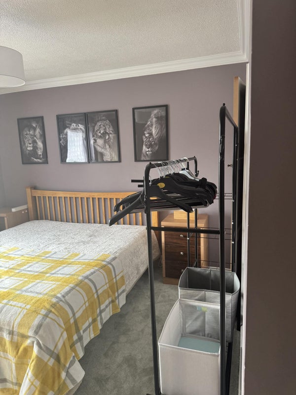 Room is fully furnished: has a super king size bed with firm, orthopaedic mattress, very large wardrobe space (3x double wardrobes). The bathroom that is next door in the hallway has a large bathtub with rainfall shower. Separate toilet. To be shared with me, single young girl and single young guy who’s never home.
