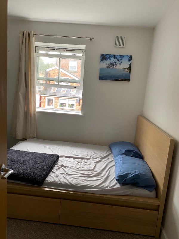 Double room, furnished with double bed with draws and a place to with an open wardrobe.