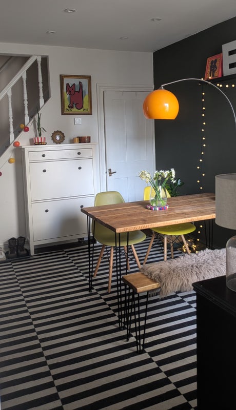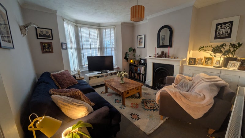 • Room is a good size double and newly decorated. Small double bed, brand new mattress supplied. Currently a futon frame, standard bed frame available. New curtains installed since photo taken. Storage for suitcases etc in the loft.