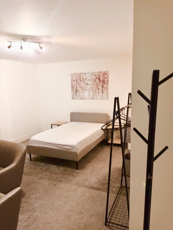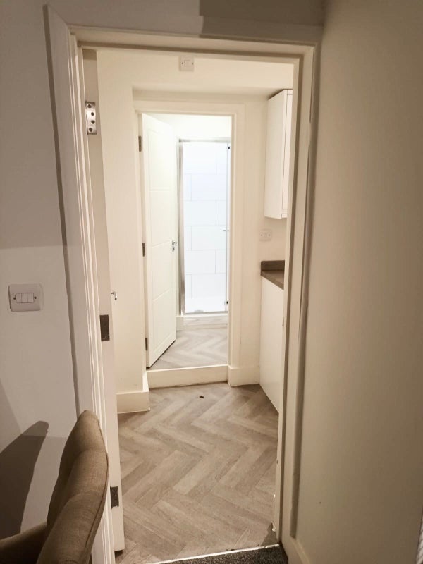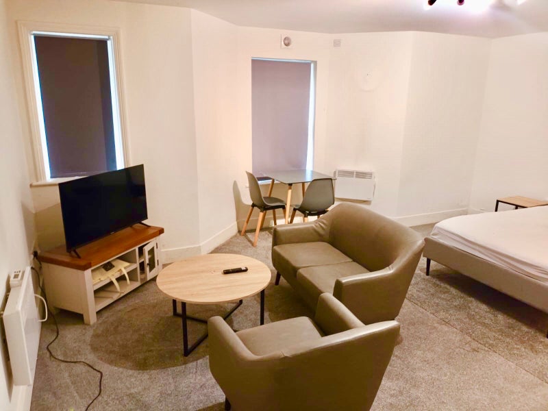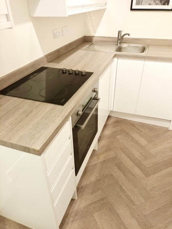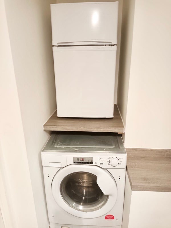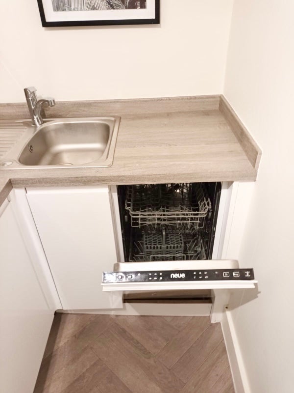 It features an open-plan kitchen that connects to the living room and is equipped with built-in appliances, including a dishwasher, a washing machine, and an induction cooker.