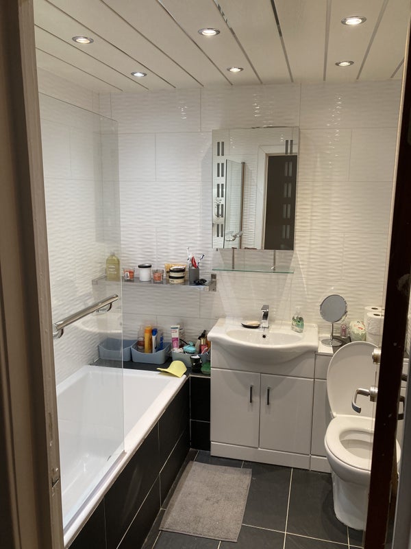 Two bedroom flat: living area with kitchen and dining table shared. Recently renovated bathroom in excellent condition.