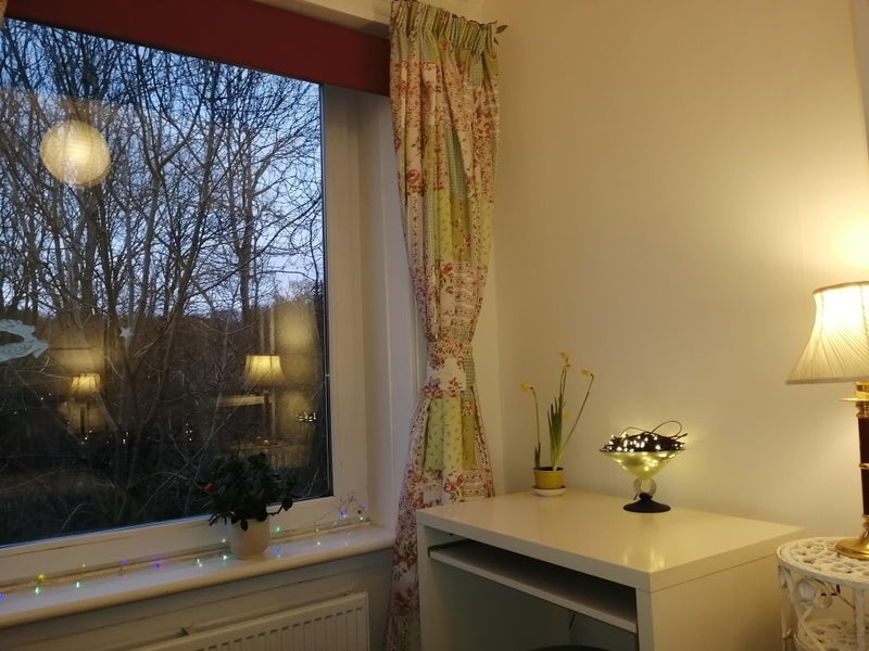 Bright, cosy single room available. Very friendly flat in resitdential area. Big kitchen, with dining area, sofa, all white goods, suitable for cooking and enjoying meals, with tree lined view of large back garden which is beside the canal, where you can access lovely walks or cycles. Room itself has single bed, wardrobe, desk etc. Ground floor flat, so as well as a big communal garden out back we have access to our own garden in the front. Free on street parking and train station within 5 minutes walk. Buses along Great Western Road within 5 minutes walk too. Quiet, friendly close. Would suit professional or mature student.