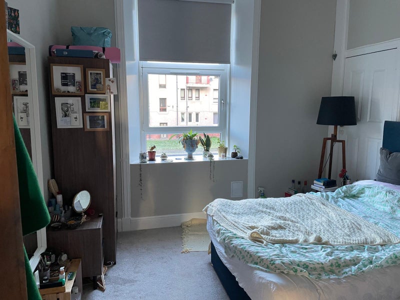 The flat is in dennistoun, it’s a five minute walk from Alexandra parade train station which gets you into town in ten minutes. It’s also a five minute walk from Alexandra park, which is lovely and super nice for lunch break walks. It’s a first floor flat so not too cold, the living room is south facing. The neighbours are nice. Bills usually come to around £150 each inc council tax. The bedroom shown would be yours.