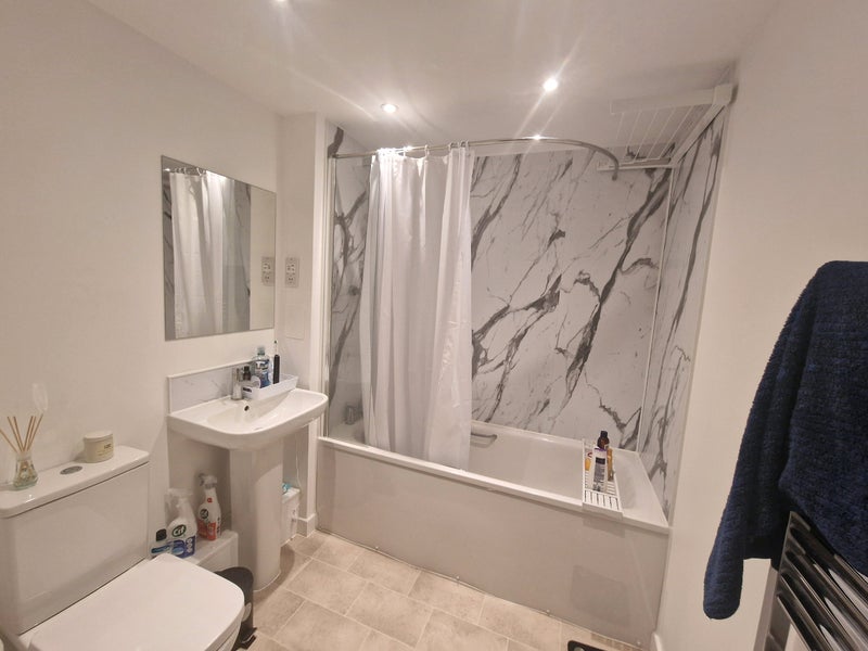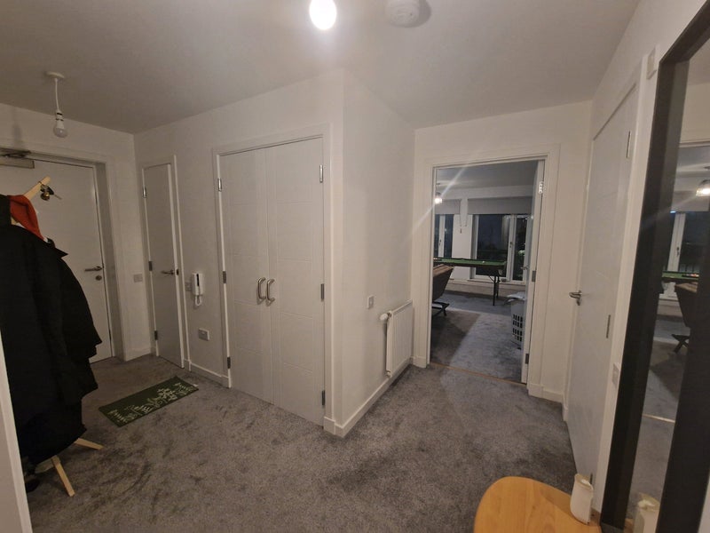 I'm looking for a short term flatmate in this 2 Bed 2 Bath flat. The room with the desk and monitors is the one up for taking (Will be cleared out and a bed can be arranged) - You have a private bathroom and a shared living room, kitchen. The room comes with a built-in Wardrobe.