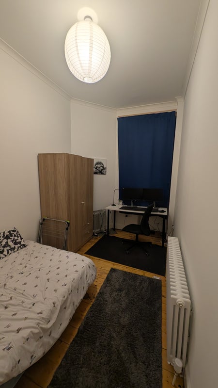 Spare room in my flat available with queen sized bed. Fully furnished with desk space and large wardrobe. Ground floor flat on a fairly quiet street.