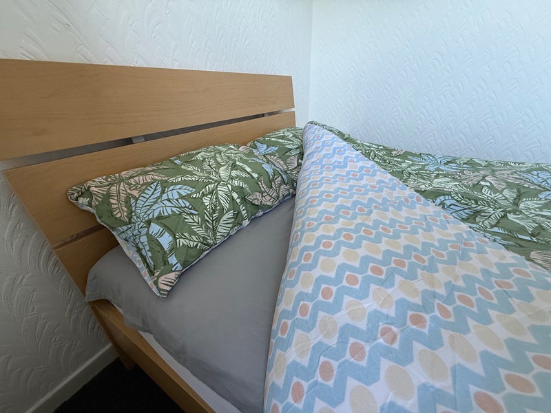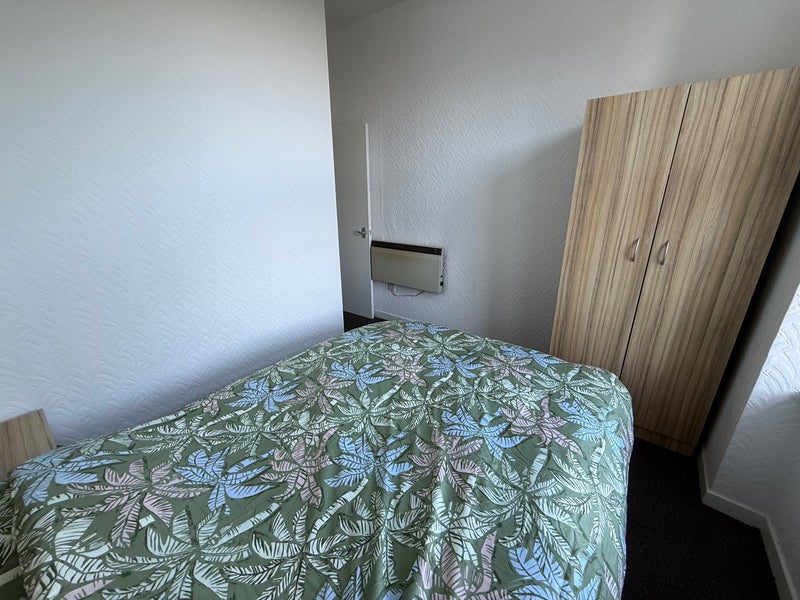 The flat is fully furnished and includes a bed, fridge, cooker, and washing machine.