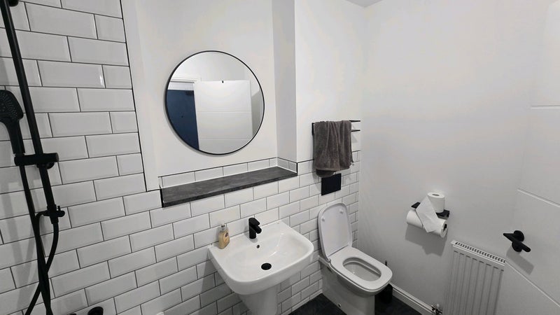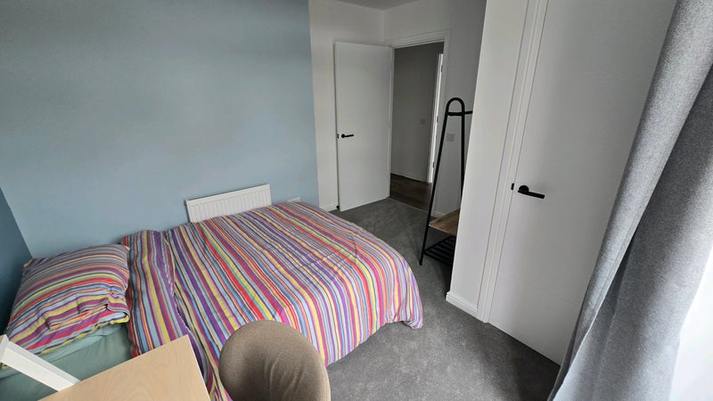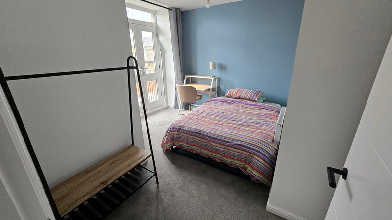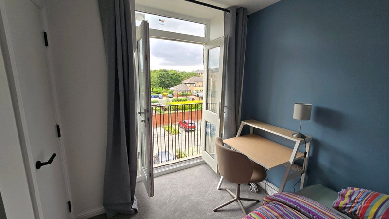 The available room is a bright double bedroom with a Juliette balcony, desk, and plenty of cupboard space. While it’s not an ensuite, you would have your own private bathroom located just across the hall.