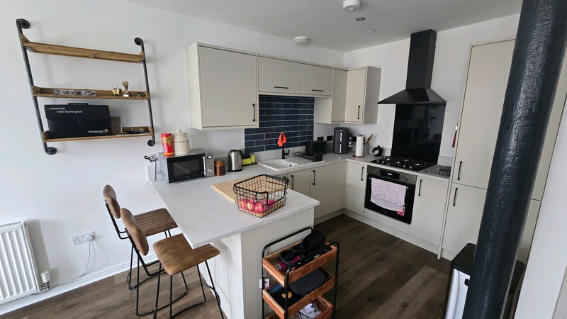 The flat has a modern open-plan living room and kitchen, making it a comfortable and relaxed place to live.