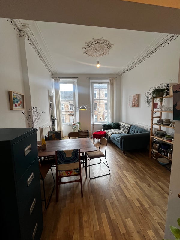 Double room available in a lovely flat in Govanhill. The flat is located 2 minutes off Victoria Road on a quiet street, 5 minutes walk from Queen’s park and conveniently right opposite The Rose Reilly.