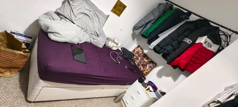 A comfortable and well-lit room available in a friendly shared house. The room comes furnished with a bed, storage space, and clothing racks, making it ideal for a single occupant.