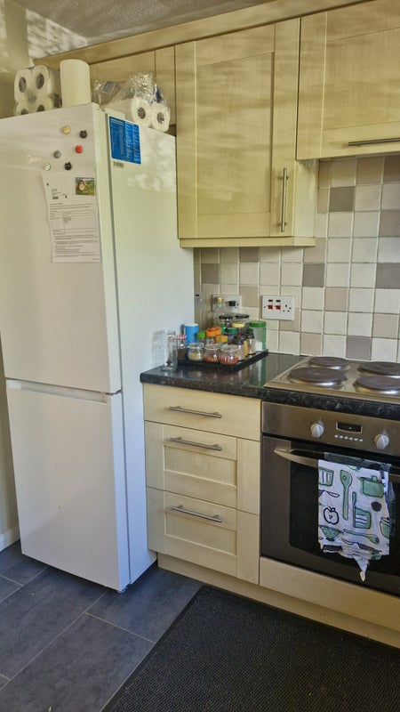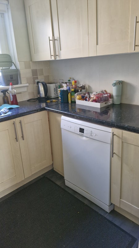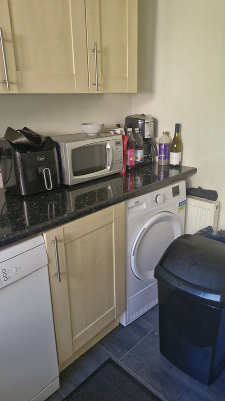House is fully furnished with all equipments available in the kitchen. Flat comes with washing machine and tumble dryer!