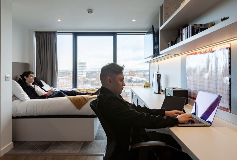 Our location, nestled between the University of Glasgow, Glasgow Caledonian University, and the University of Strathclyde, makes us the top choice for students from these institutions. Our accommodations come packed with features to enhance your university experience: enjoy an ensuite bedroom with a double bed and true mattress, plus a full-length mirror. Stay connected with unlimited high-speed Wi-Fi (up to 100Mbps wired) and catch your favorite shows on a smart TV in your room.