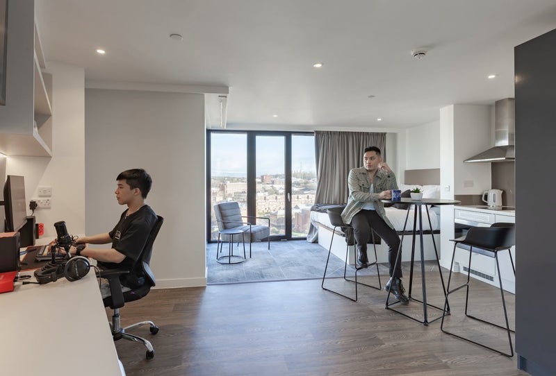 Our location, nestled between the University of Glasgow, Glasgow Caledonian University, and the University of Strathclyde, makes us the top choice for students from these institutions. Our accommodations come packed with features to enhance your university experience: enjoy an ensuite bedroom with a double bed and true mattress, plus a full-length mirror. Stay connected with unlimited high-speed Wi-Fi (up to 100Mbps wired) and catch your favorite shows on a smart TV in your room.