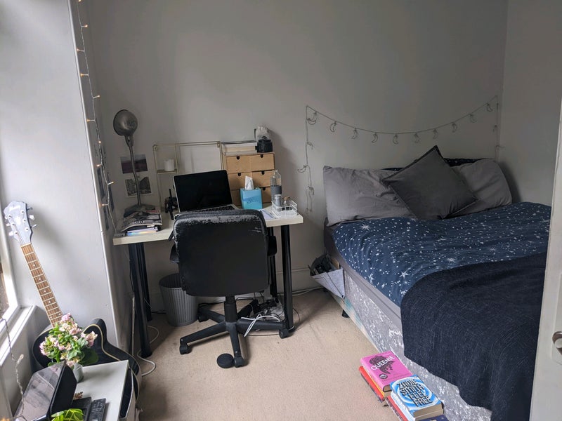 The room is small, sunny and has a dresser and a desk. There's one shared bathroom, a kitchen and a large living room, as well as a residents' garden at the front. The bathroom was fully refurbished in 2023 so is a bit nicer than the one in the pictures!