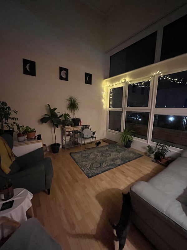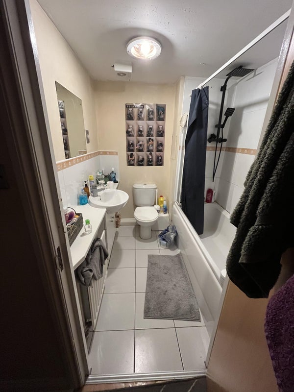 The flat has two floors; with an upper living room on a mezzanine and a lower living room, there are 2 rooms upstairs and one downstairs. The kitchen is fully equipped with 3 fridges and 3 freezers and everyone has one shelf/cupboard each. The bedroom on offer is upstairs has a lock, is part furnished with a wardrobe. You would only share a bathroom with one other person as I have an en suite.