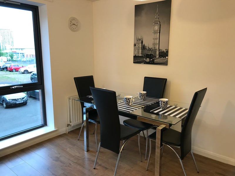 Share bright lounge and large dining kitchen with table & chairs, dishwasher, washing machine & tumble dryer.