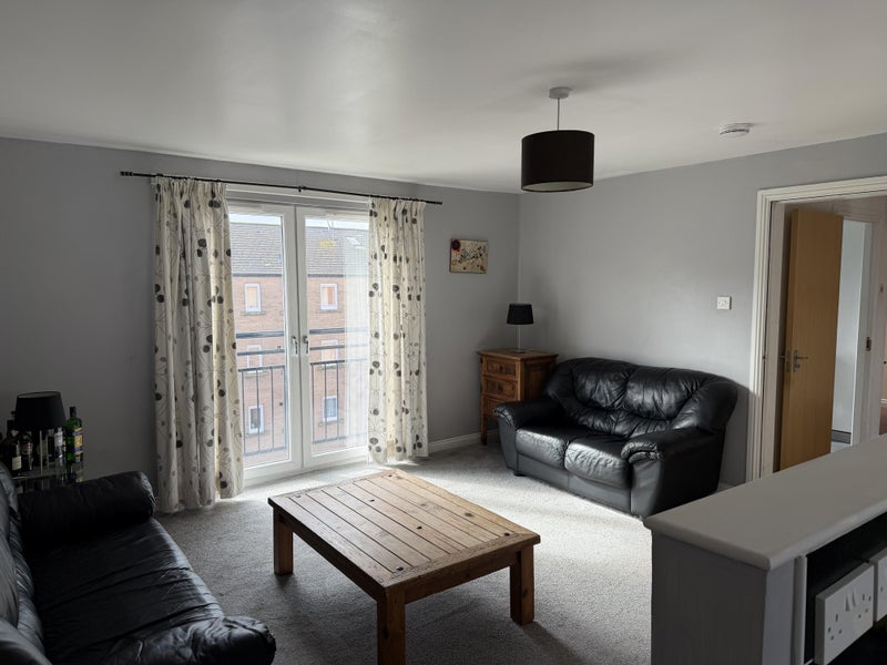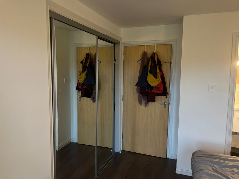 The flat includes an en-suite double bedroom with a Juliet balcony; the bathroom was refurbished two years ago. There is also another double bedroom, occupied by myself, with a separate external bathroom. In addition, there are two cupboards, one of which contains a tumble dryer, and finally a large living room and a spacious kitchen, both featuring two Juliet balconies and two large full glass windows.