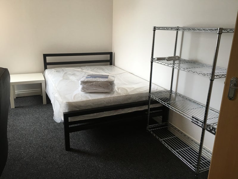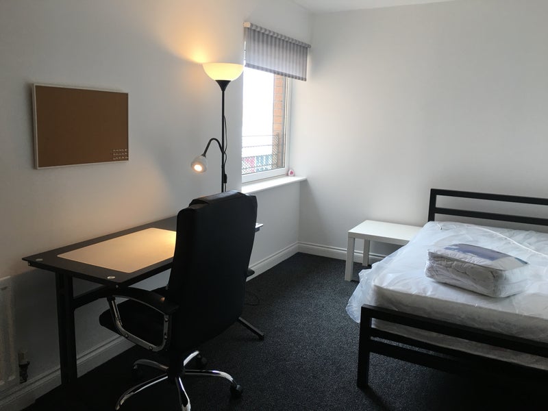 Room has quality double bed, nice desk and leather executive chair, fitted wardrobe and chrome shelving.
